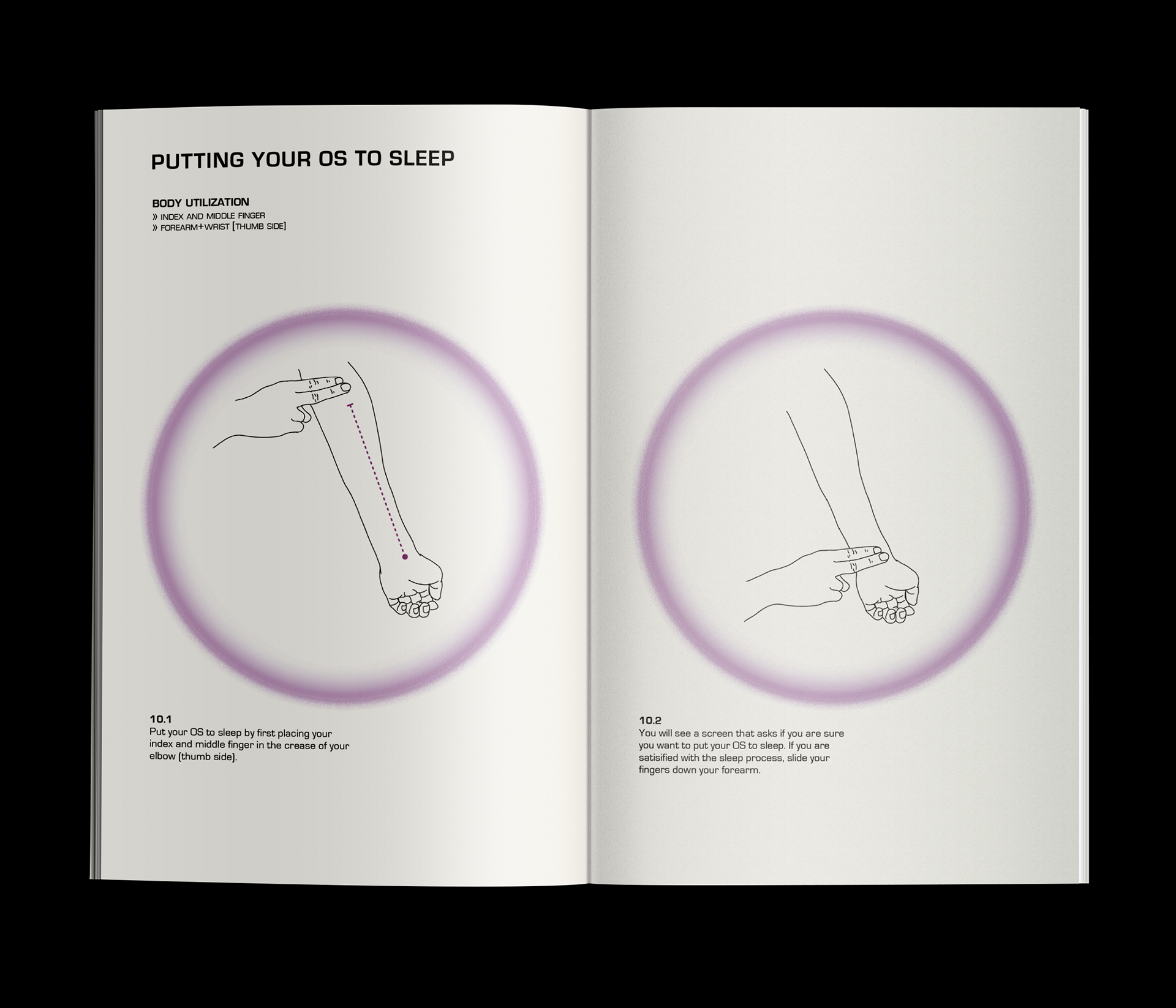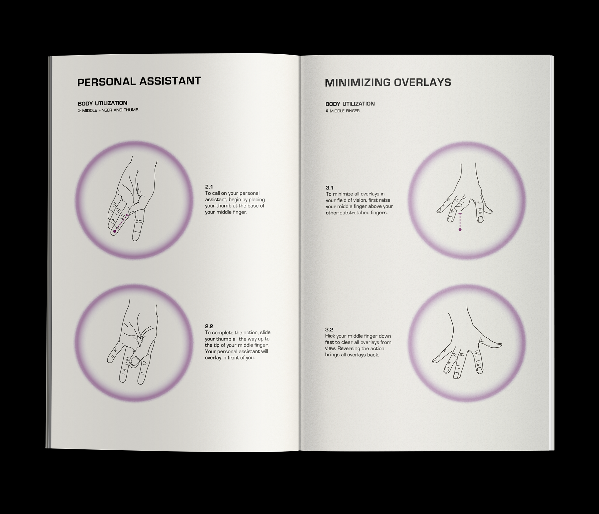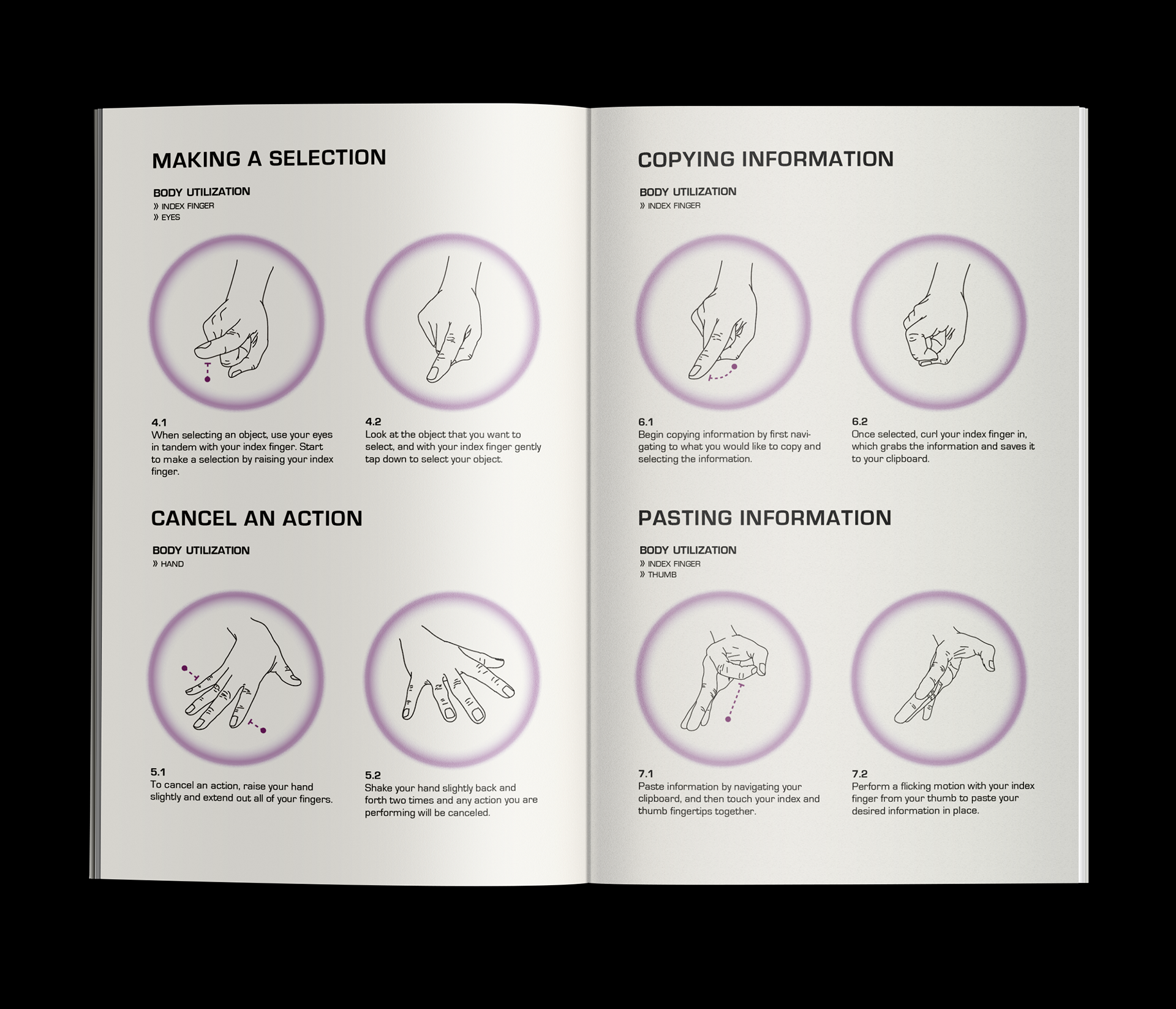 Solution – Sure, the future will be full of ways to communicate with the technology at hand, however, I believe gestures to be the primary form of communication. Working closely with Ellen Lupton, I created a small publication based on my thesis research where I created a gestural language set. The set of gestures convey various tasks which can be performed in a human-integrated computer.